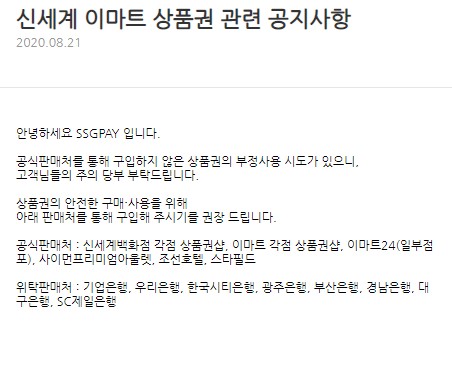 기타 공식판매처는 신세계 백화점 각종 상품권샵으로 알려져 있습니다.